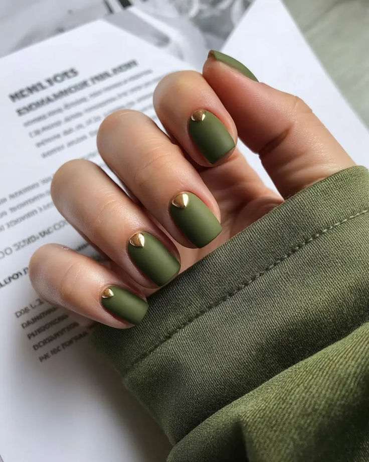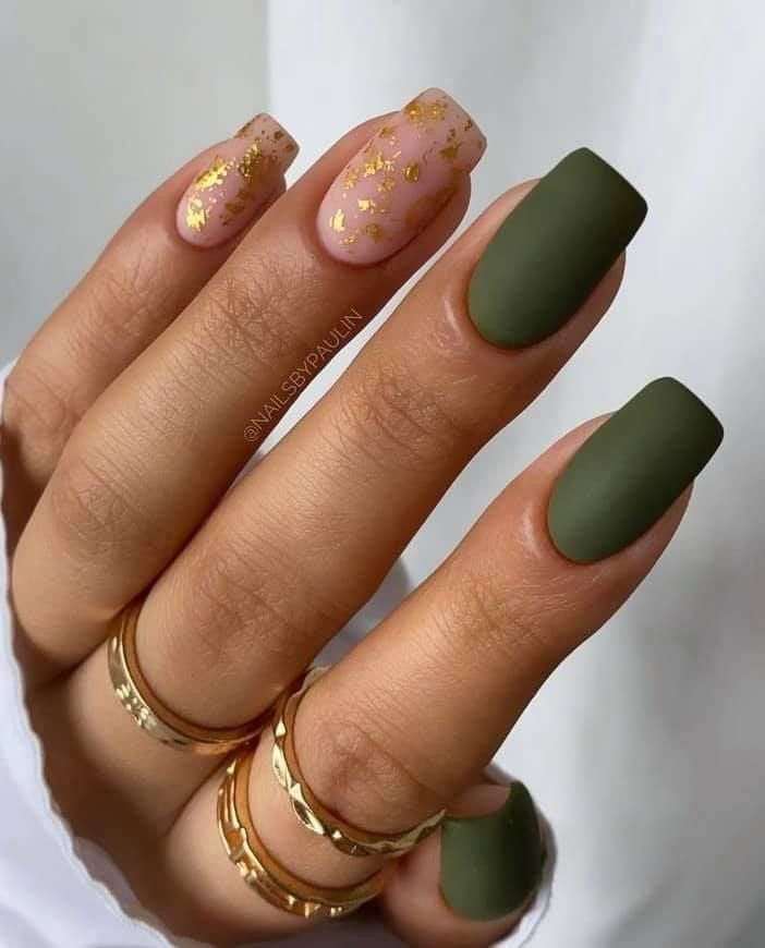 This design pairs deep matte olive green with soft nude nails sprinkled in shiny gold foil. The mix of earthy and glam feels effortlessly chic, perfect for cozy fall days when you still want a touch of sparkle.