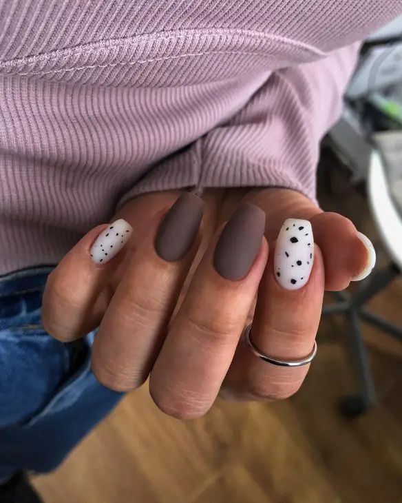 These nails pair soft matte brown shades with playful speckled white accents, creating a look that’s both cozy and modern. The earthy tones bring warmth, while the speckled details add a fun twist, making the style feel unique yet effortlessly wearable. Perfect for fall, they strike the right balance between chic and casual.