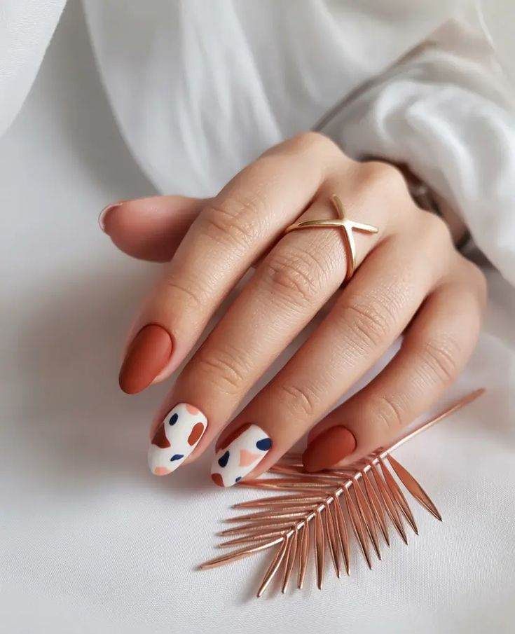 These nails blend cozy rust-orange matte shades with terrazzo-inspired art on two accent nails. The mix of warm, earthy tones and playful pops of navy and blush on a crisp white base gives a chic yet artsy vibe perfect for a stylish fall manicure with a minimalist twist.