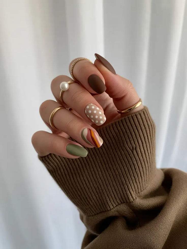 This nail design combines cozy autumn vibes with a creative twist, featuring rich, matte browns, olive green, and warm beige tones. One nail is playfully dotted, another shows wavy fall-inspired stripes, while the rest are simple and solid for a charming, eclectic mix. It’s a fun and stylish look, perfect for anyone who loves both earthy colors and a touch of whimsy.