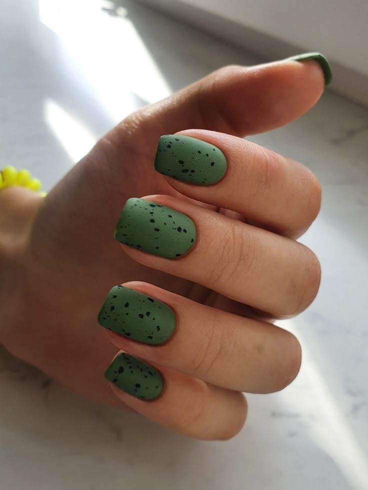 These nails feature a fresh matte green base sprinkled with chic black speckles, giving them a fun, modern twist. The look is playful yet stylish, almost like a trendy “speckled egg” effect, perfect for adding a bit of uniqueness to your everyday style.