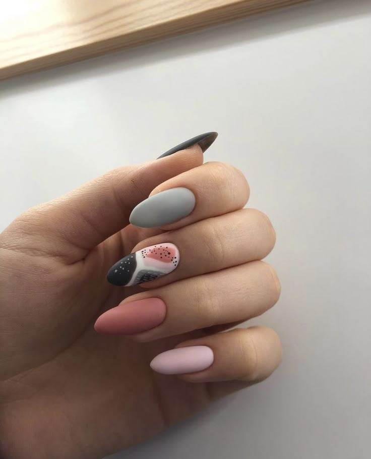 These nails blend gentle matte shades of grey, pink, and charcoal with a playful accent nail full of artistic details. The mix of soft tones feels calm and cozy, while the creative design adds a touch of fun personality. Simple yet unique, they bring a modern and stylish vibe to any look.