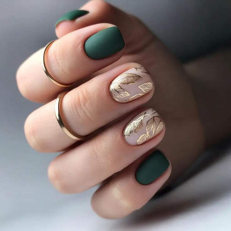 This elegant design features deep forest green nails paired with creamy beige accents, beautifully decorated with shimmering gold leaf patterns. The matte finish gives a soft, modern touch, while the golden leaves add a hint of luxury and charm. Perfect for those who want a refined, nature-inspired look that’s both striking and delicate.