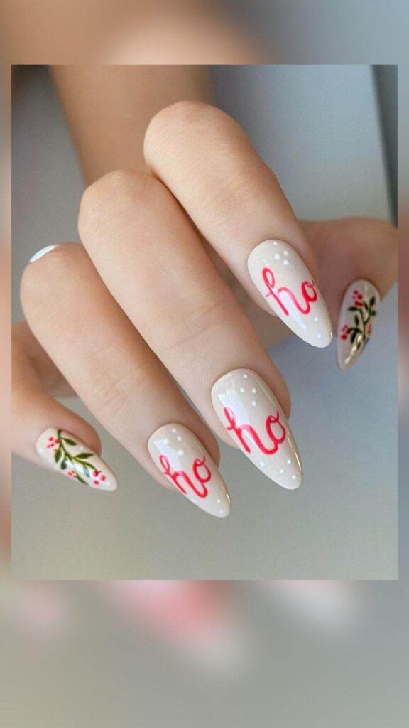 This nail design looks so good for Christmas. These are unique and pretty nail art, and they look more beautiful on almond-shaped nails. This nude shade base and red and green make a magical combination.
